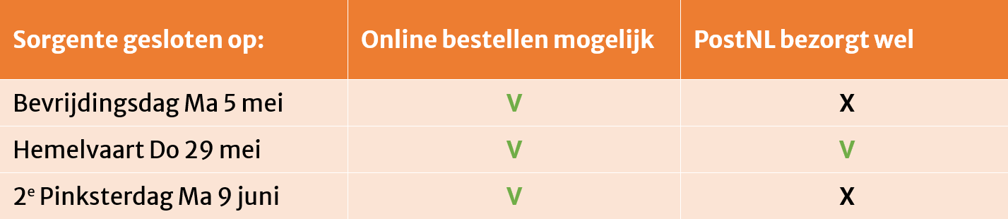 Wij adviseren u online via Mijn Sorgente te bestellen. Activeer hiervoor snel en gemakkelijk uw Mijn Sorgente account en log in. U kunt dan onder andere zelf uw bezorgmoment en PostNL locatie kiezen. Heeft u al een account maar weet u niet hoe u kunt bestellen? Kijkt u dan op onze website naar de stap voor stap uitleg.