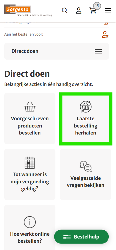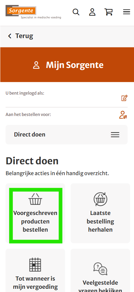 Ga naar uw ‘Mijn Sorgente’ account, u komt gelijk op het 'Direct doen' scherm terecht. Klik op 'voorgeschreven producten bestellen' om een overzicht van alle producten te zien die u kunt bestellen.