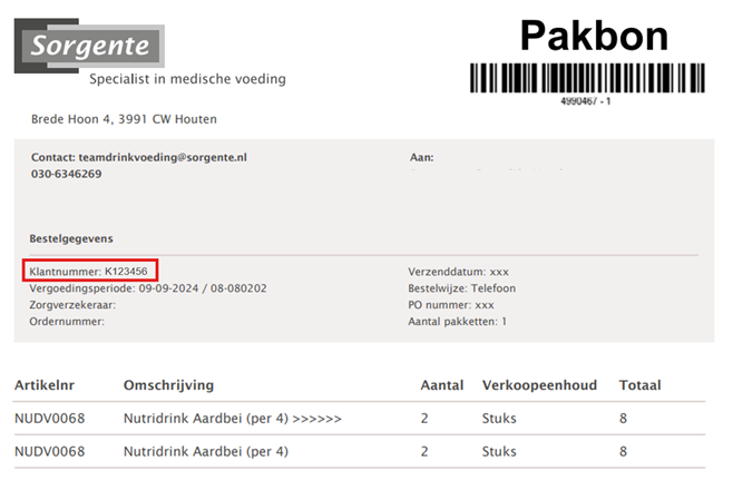 - Bovenaan uw pakbon. U vindt de pakbon in de doos van iedere bestelling.