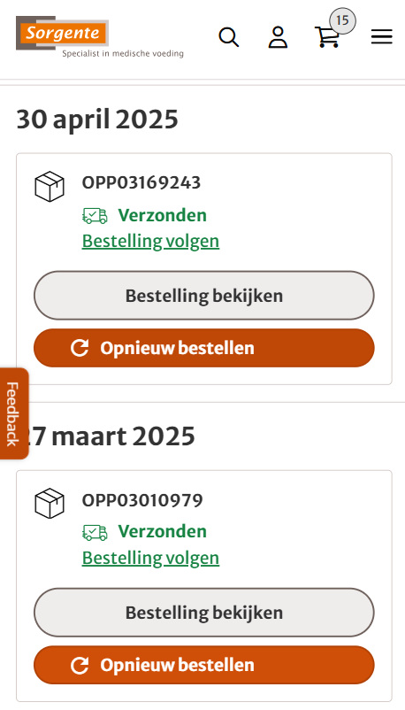 Wilt u een bestelling van langer geleden opnieuw bestellen? Ga via het menu naar 'Mijn bestellingen'. Hier kunt u de gewenste bestelling uitkiezen en met de knop 'Opnieuw bestellen'. Via de knop ‘Bekijken’ kunt u eventueel bekijken welke producten er in uw bestelling zaten.