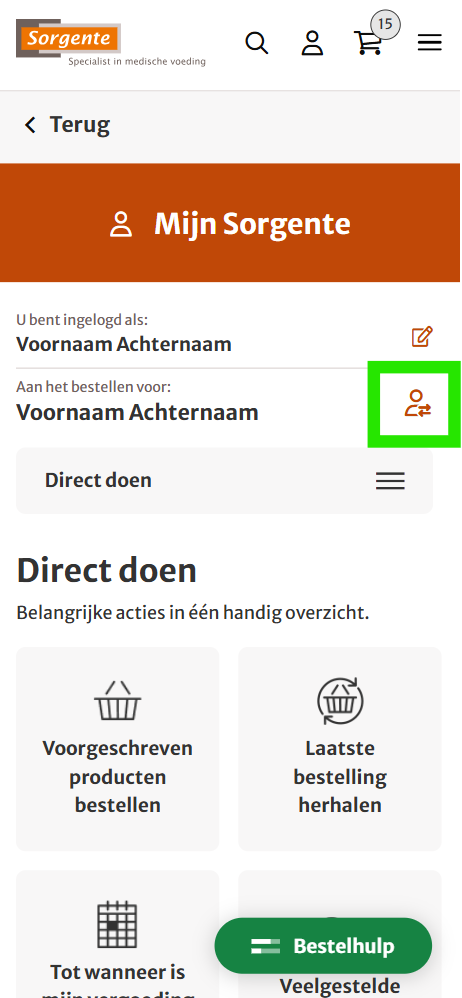 - Op het moment dat u bent gewisseld van account ziet u dit terug aan de naam die vermeld staat onder de tekst ‘aan het bestellen voor:’.