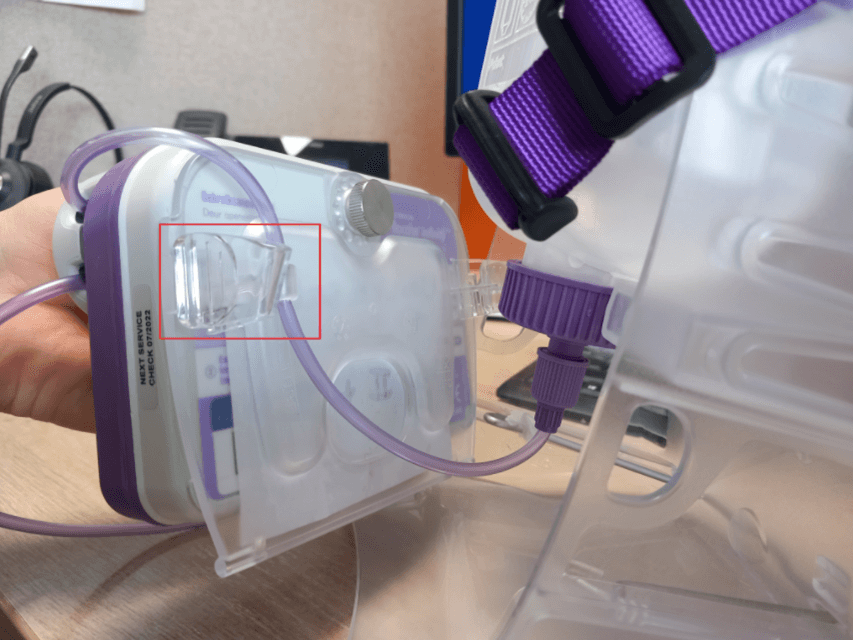 Dit komt voor bij de Infinity pomp en vooral bij voeding waar de ‘Enteral Feedingset Dop Paars’ wordt gebruikt. Om dit te voorkomen klemt u het systeem aan de achterzijde van de pomp vast in het frame. Zie ook de foto hieronder.